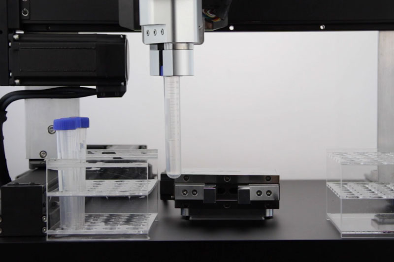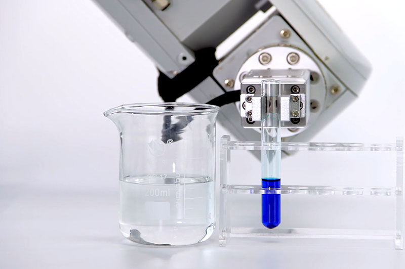 卡西姆电动夹爪,恒力夹持玻璃试管,将试管中试剂导入试液中混合反应,无滑落、无损坏试管,无试剂飞溅、溢出。